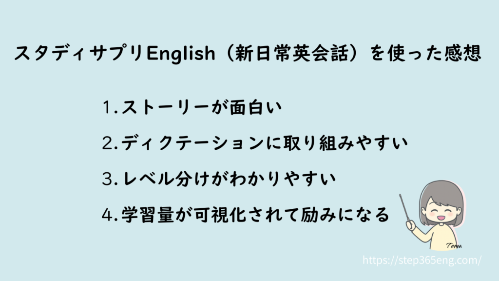 私は、スタディサプリENGLISH(新日常英会話)の最大の価値は、英語に毎日触れ続ける土台になることだと感じました。