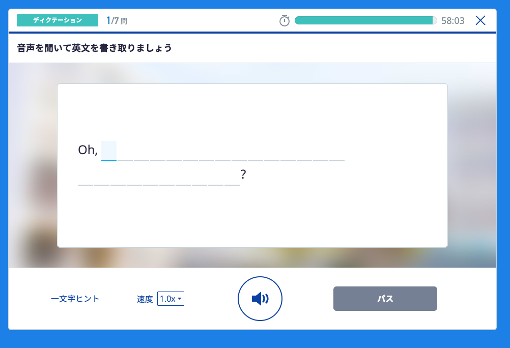 ディクテーションには、このアプリで初めて取り組みましたが、非常にスムーズに音声を聴くことと入力すること、そして答え合わせができるのでゲーム感覚で続けられました。